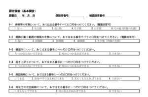 多くの市区町村や介護支援事業所では、認定調査票の質問項目を事前に確認できるチェックリスト(PDF)を公開しています。事前に確認して回答を準備しておくことで、調査当日の伝え漏れを防げます。